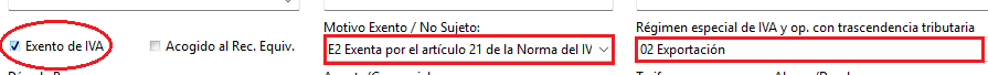 Pero no basta solo con eso. Ahora hay que indicar, además, el Régimen especial de IVA = «02 – Exportación» y, en «Motivo Exenta/No Sujeta«, deberemos indicar «E2 – Exenta por el artículo 21 de la Norma del IVA» en la Ficha de nuestro Cliente: