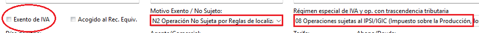 Cuando se trata de Servicios, y no de bienes, la cosa cambia. En este caso, la factura NO está Exenta de IVA, sino «No Sujeta«, y deberemos indicar el «Motivo Exento / No Sujeto» = «N2 – Operación No Sujeta por Reglas de Localización», y el Régimen especial = «08 – Operaciones sujetas al IPSI/IGIC».