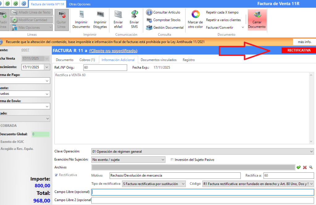 Una vez finalizado el proceso, si accedemos a la Factura Rectificativa comprobaremos como ésta figura marcada como RECTIFICATIVA, e indica a qué documento rectifica…
