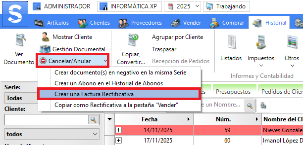 En ésta ocasión podremos simplificar el proceso y realizar el documento en negativo desde la ventana HISTORIAL, seleccionando el documento a rectificar y pulsando la opción CANCELAR/ANULAR>CREAR UNA FACTURA RECTIFICATIVA.