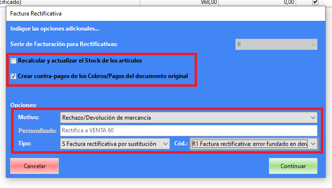 Luego, se nos mostrará el asistente donde podremos activar opciones como la que permite generar contra cobros e indicar el motivo, el «Tipo de Factura Rectificativa» y el «Código de Factura Rectificativa».