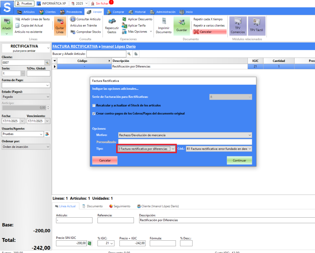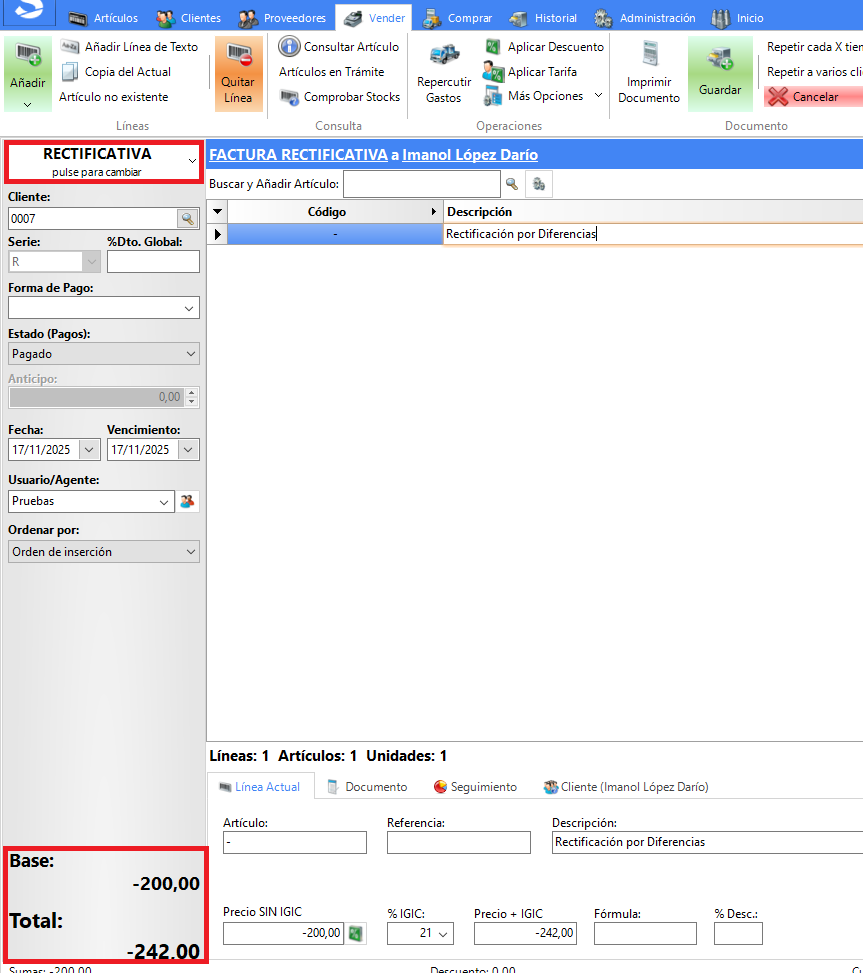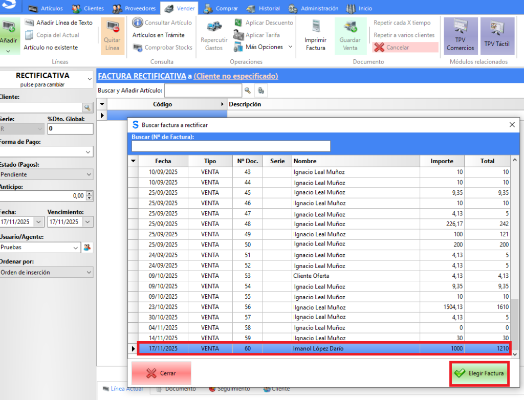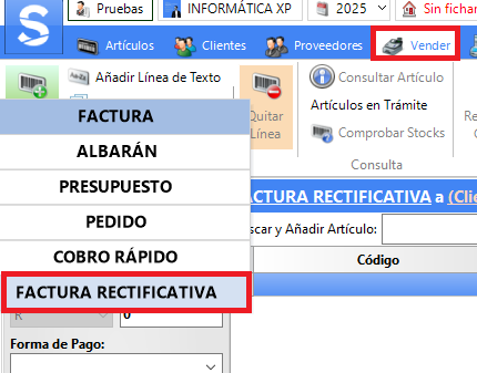 Para ello, iremos a la ventana VENDER y seleccionaremos el tipo de documento FACTURA RECTIFICATIVA...
